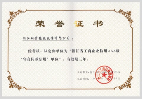 据悉,,,,,,,,浙江省工商企业“守条约、重信用”单位分A、AA、AAA三级,,,,,,,,由企业自愿申报后,,,,,,,,划分由县(市、区)、市、省工商局审核认定。。。。。。公司十分重视条约信用治理,,,,,,,,一直建设完善条约信用治理系统,,,,,,,,增进了企业康健稳固生长。。。。。。