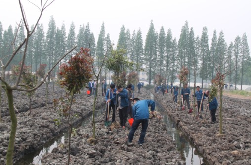 4月17日上午,,,,,,,在洲泉镇众安村一片刚刚翻土完毕的逍遥上,,,,,,,几十名身穿蓝色事情服的企业员工捋起袖子,,,,,,,挥舞铁锹,,,,,,,战战兢兢地栽种着一株株树苗。。。。。这片占地32亩的片林又名“PG麻将胡了林”。。。。。